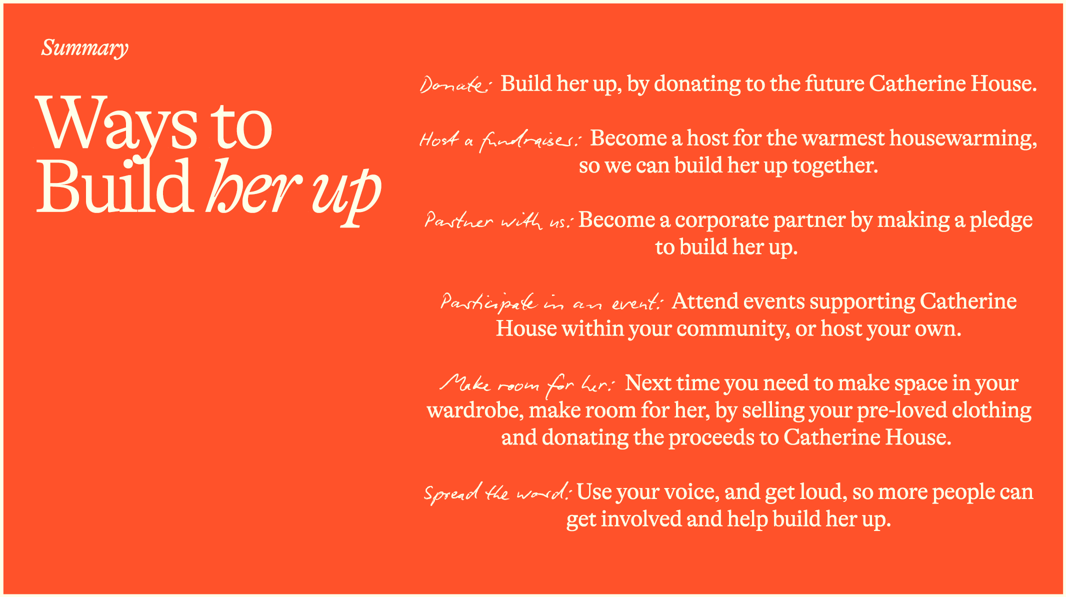 The campaign serves as both a call to arms, and a mantra for the lasting impact of Catherine House’s work.